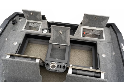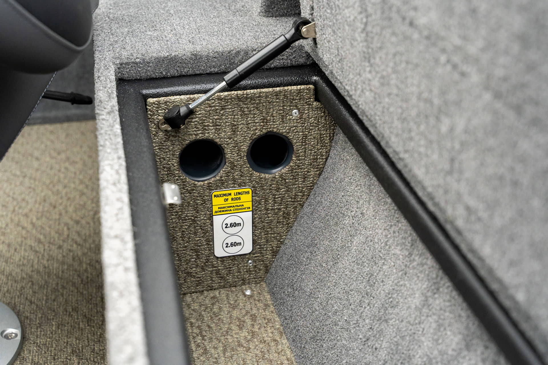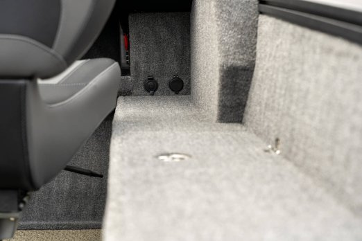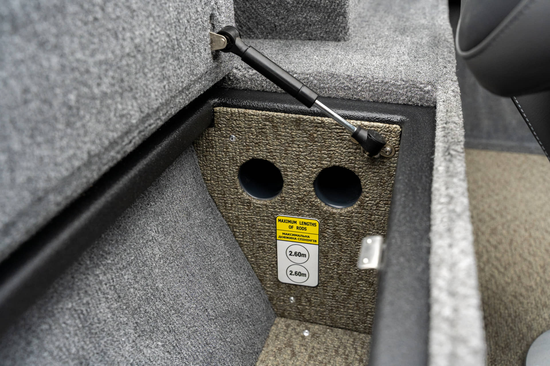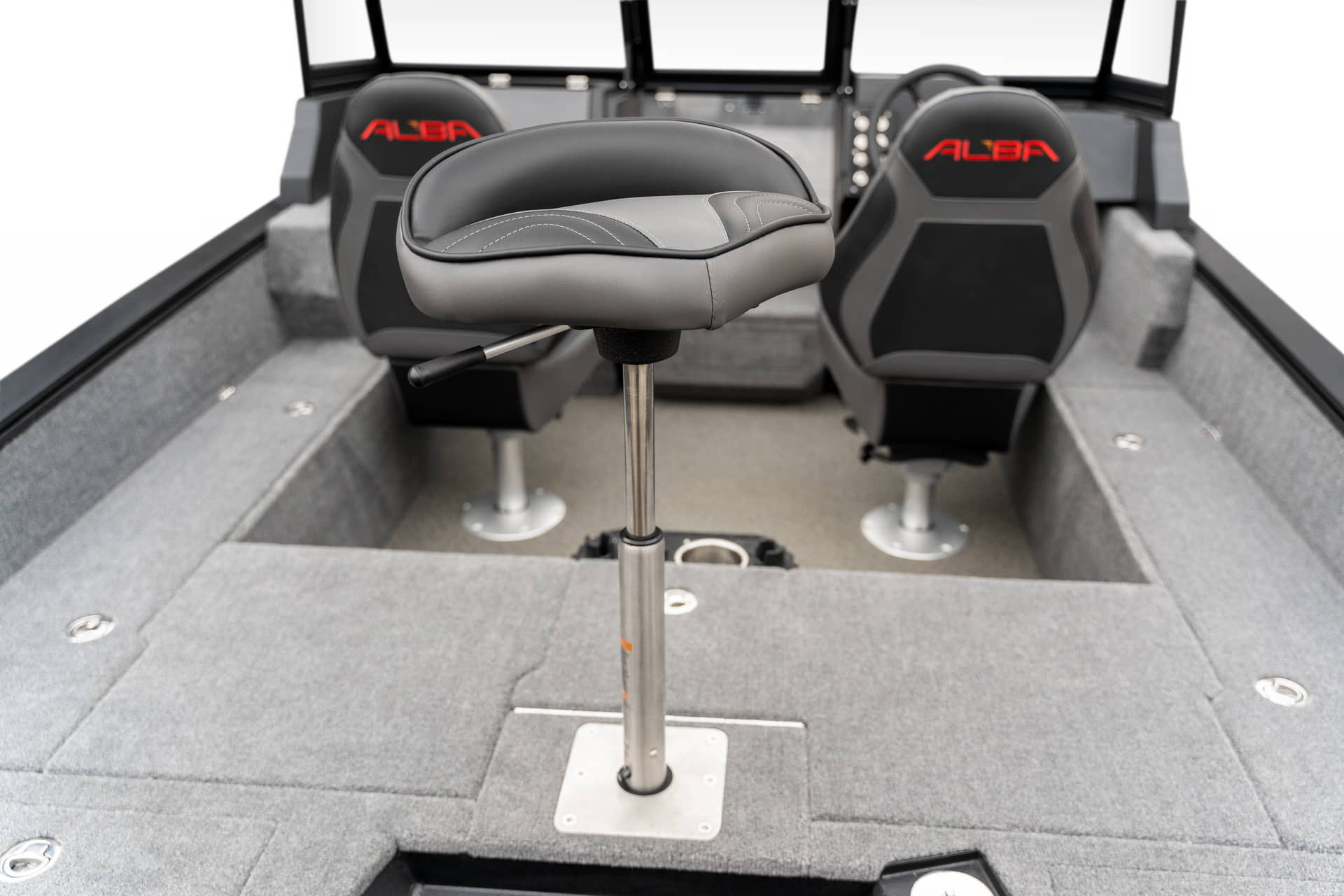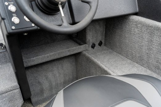 Celosvařené tělo Dvě konzole s kaleným sklem Lodní exteriérový koberec (rybářská paluba, zadní rybářská paluba a boční strany) Vinyl (rybářská paluba, úložný prostor, kokpit) Police na pravé a levé straně se skříňkami na udice až do délky 2,60 m Suché skříňky na přední palubě - 4 ks Skříňky v zadní části 2ks Skříňka mezi sedadly a skříňka na markýzu v kokpitu Skříňka mezi konzolami pro trakční baterie 65 l nádrž na ryby s okysličováním v zadní části 75 l palivová nádrž pro přívěsný motor s palivovým filtrem Ovládací panel s 8 tlačítky Dvě USB zásuvky - typu C na konzole řidiče a spolujezdce Navigační světla (zelená, červená) Příprava na montáž echolotů, elektromotoru, trakční baterie, vysokotlakého čističe Automatické odvodňovací čerpadlo Hlavní vypínač Nohy pro rybářské sedátko jsou ukryty v předních a zadních částech Sedadla řidiče a spolujezdce na odnímatelných držácích Zadní řada sedadel "Transformer" je zabudována do zadní paluby Čtyři kotvící rohatky vyrobené z nerezavějící oceli Sada zámků na skříňky z nerezavějící oceli Řízení s lanovody