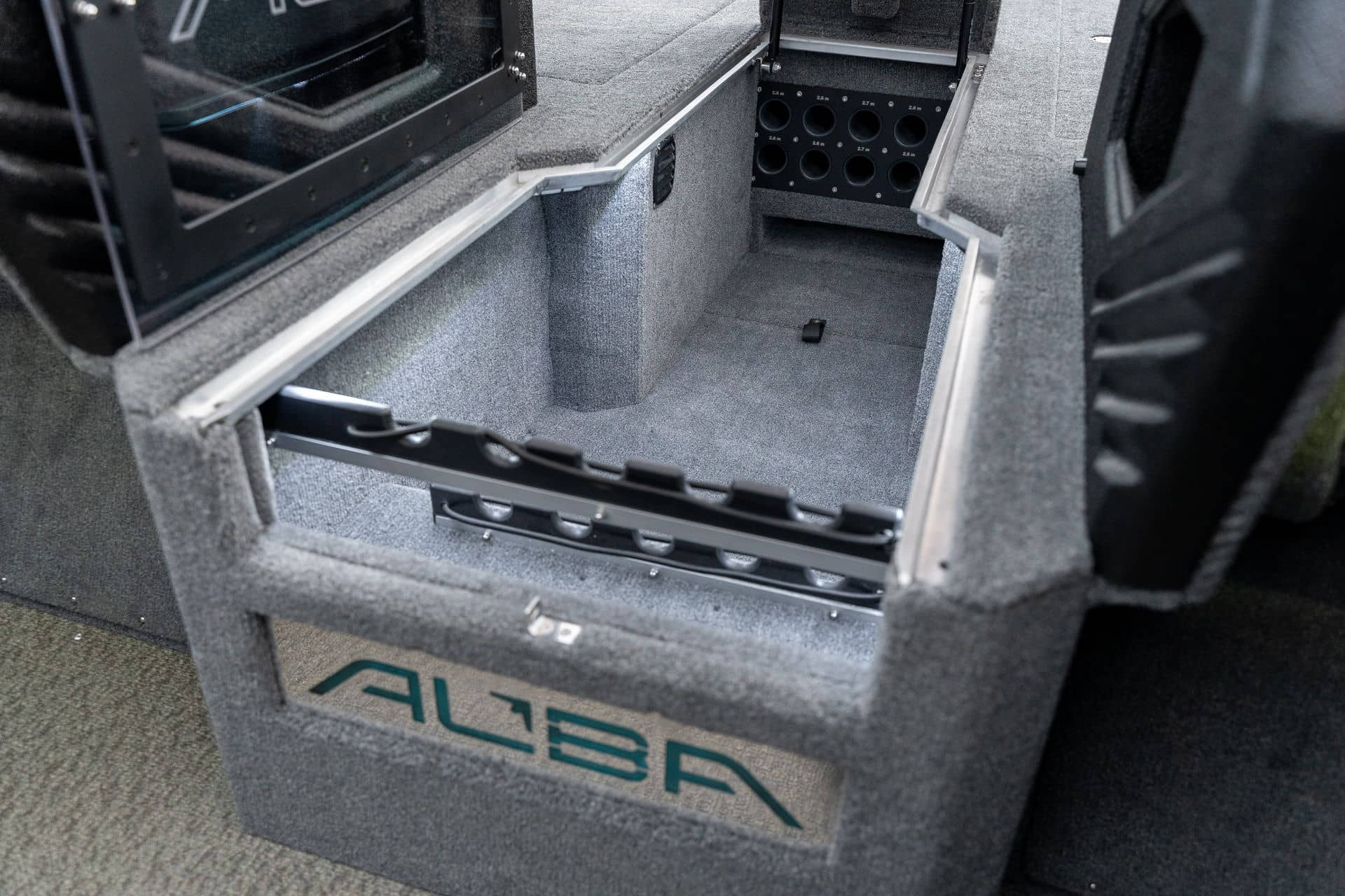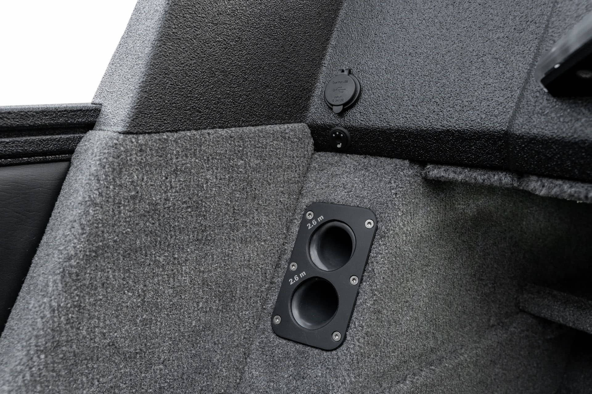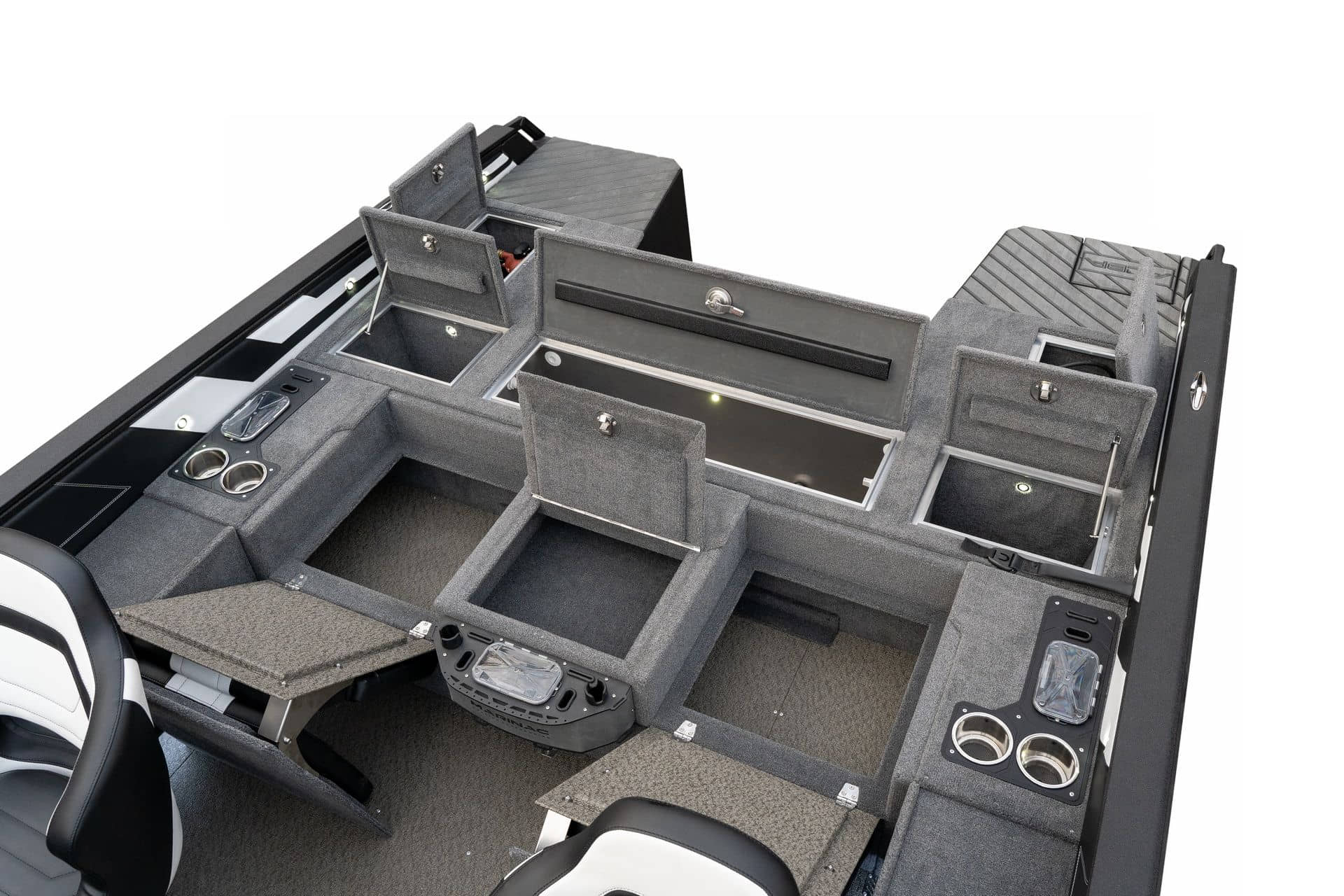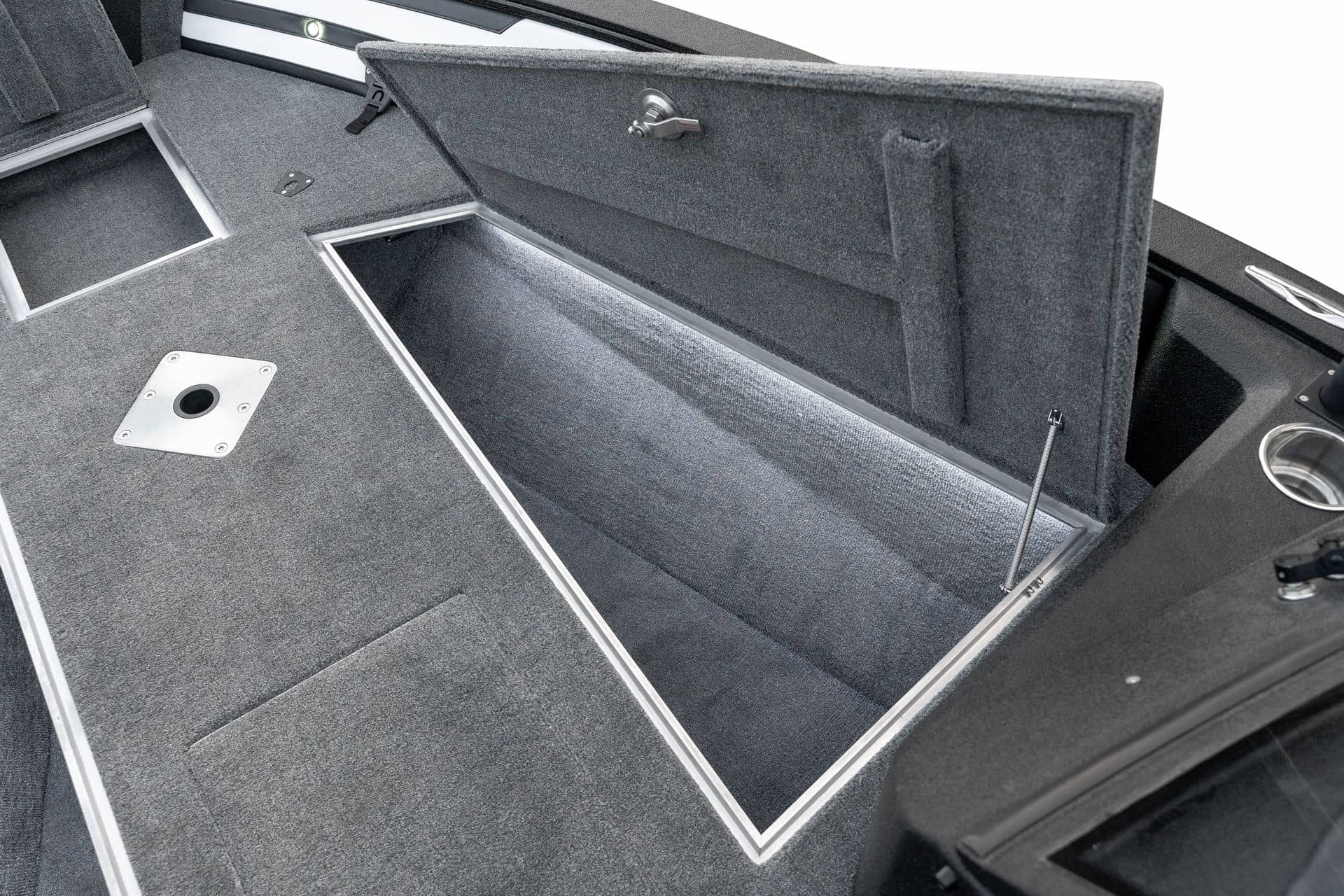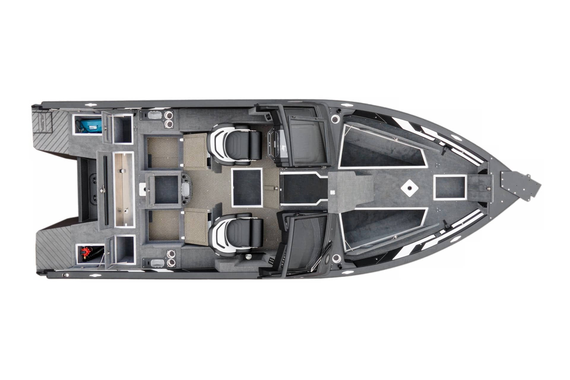 Celosvařené tělo Dvě konzole s kaleným sklem Lodní exteriérový koberec (rybářská paluba, zadní rybářská paluba a boční strany) Vinyl (kokpit) Suché boxy na věci a návnady s ventilačním a drenážním systémem Bateriový box v zadní části Úložný box na markýzu Boxy v konzolách pro uložení rybářského nářadí a osobních věcí Boční zásuvky v kokpitu 110 l nádrž na ryby v zadní části s okysličováním, osvětlením a časovačem recirkulace 227 l palivová nádrž pro přívěsný motor s palivovým filtrem Ovládací panel s 12 tlačítky Dvě USB zásuvky - typu C na konzole řidiče a spolujezdce Navigační světla (zelená, červená) LED osvětlení pro skříňky, kokpit, konzoly, paluby na přídi a zádi Nerezová rukojeť spolujezdce LED osvětlení ve skleněném rámu Zarážky pod sklo s frézovanými hliníkovými úchyty Ozdobné frézované hliníkové prolisy na bočním skle Příprava na instalaci echolotů, elektromotoru, hydraulického posilovacího čerpadla, autonomního ohřívače, vyhřívaných sedadel, vysokotlakého čističe Automatické odvodňovací čerpadlo Hlavní vypínač Nohy pro rybářské sedátko jsou ukryty v předních a zadních částech Sedadla řidiče a spolujezdce na tlumičích Zadní řada sedadel "Transformátor" na zadní palubě s individuálními organizéry pro cestující Šest výsuvných rohatek vyrobených z nerezavějící oceli Sada zámků na skříňky z nerezavějící oceli Teleskopický žebřík v pravé části Organizér mezi sedadly zadní řady Organizér pro kormidelníka Volant Krycí plachta
