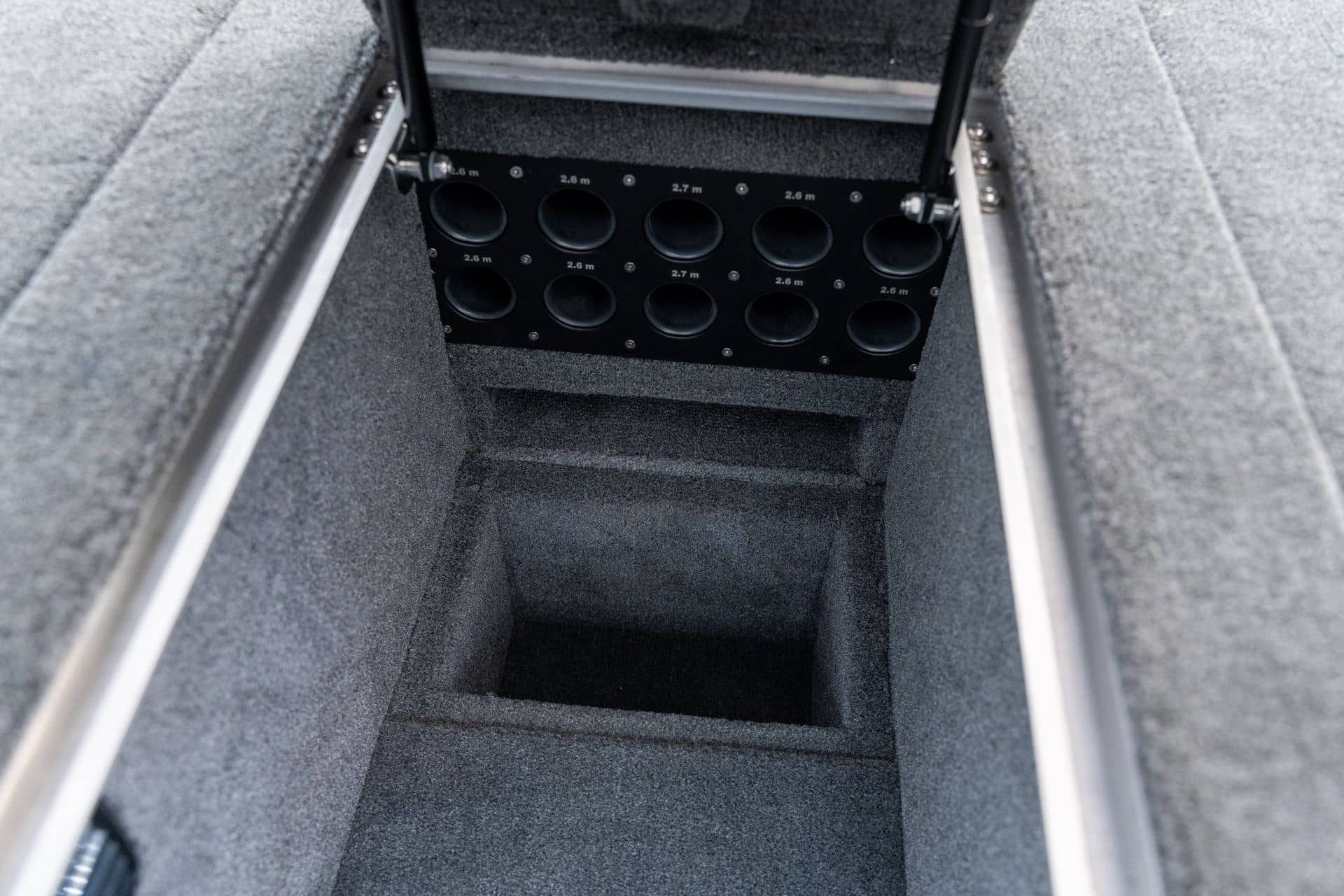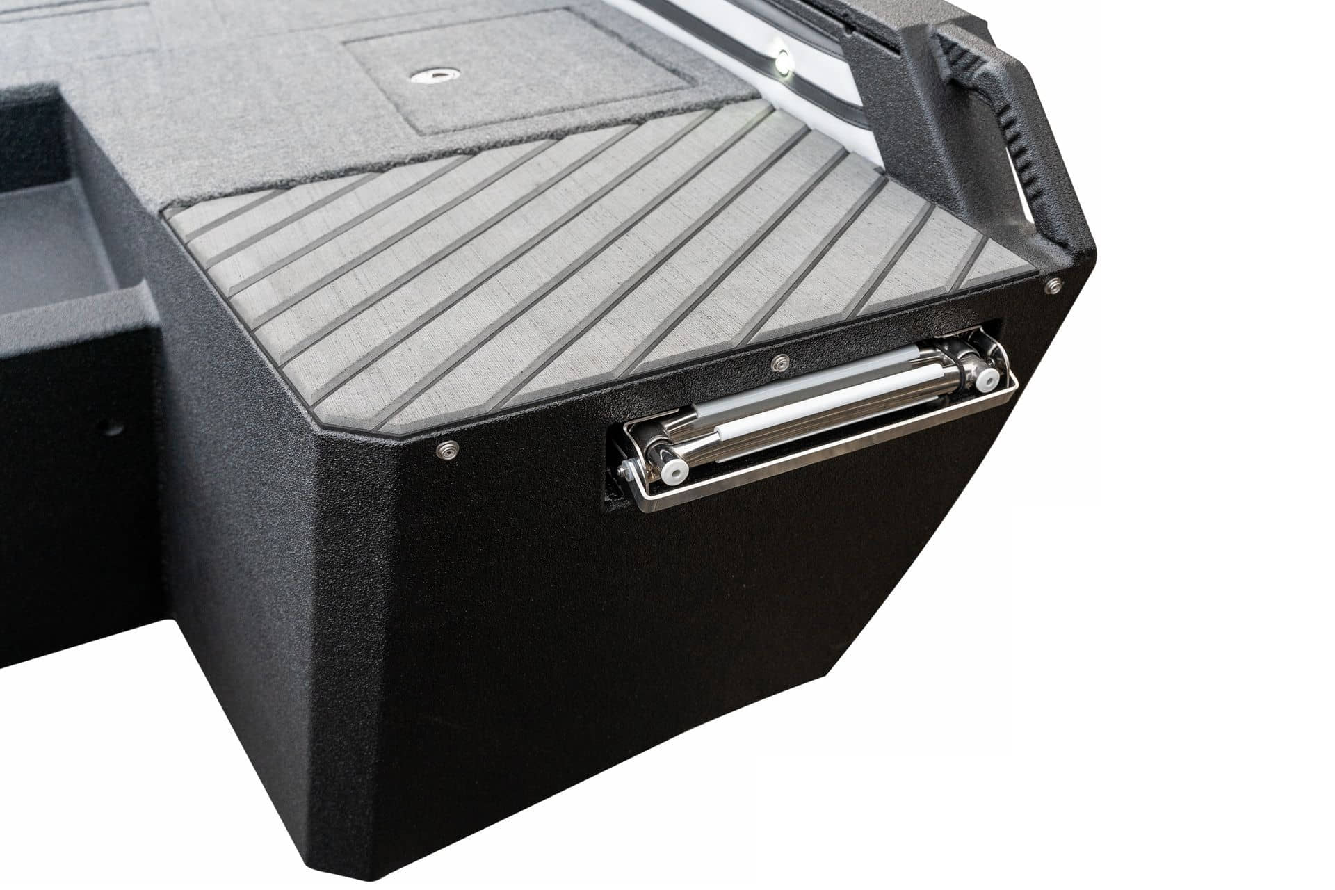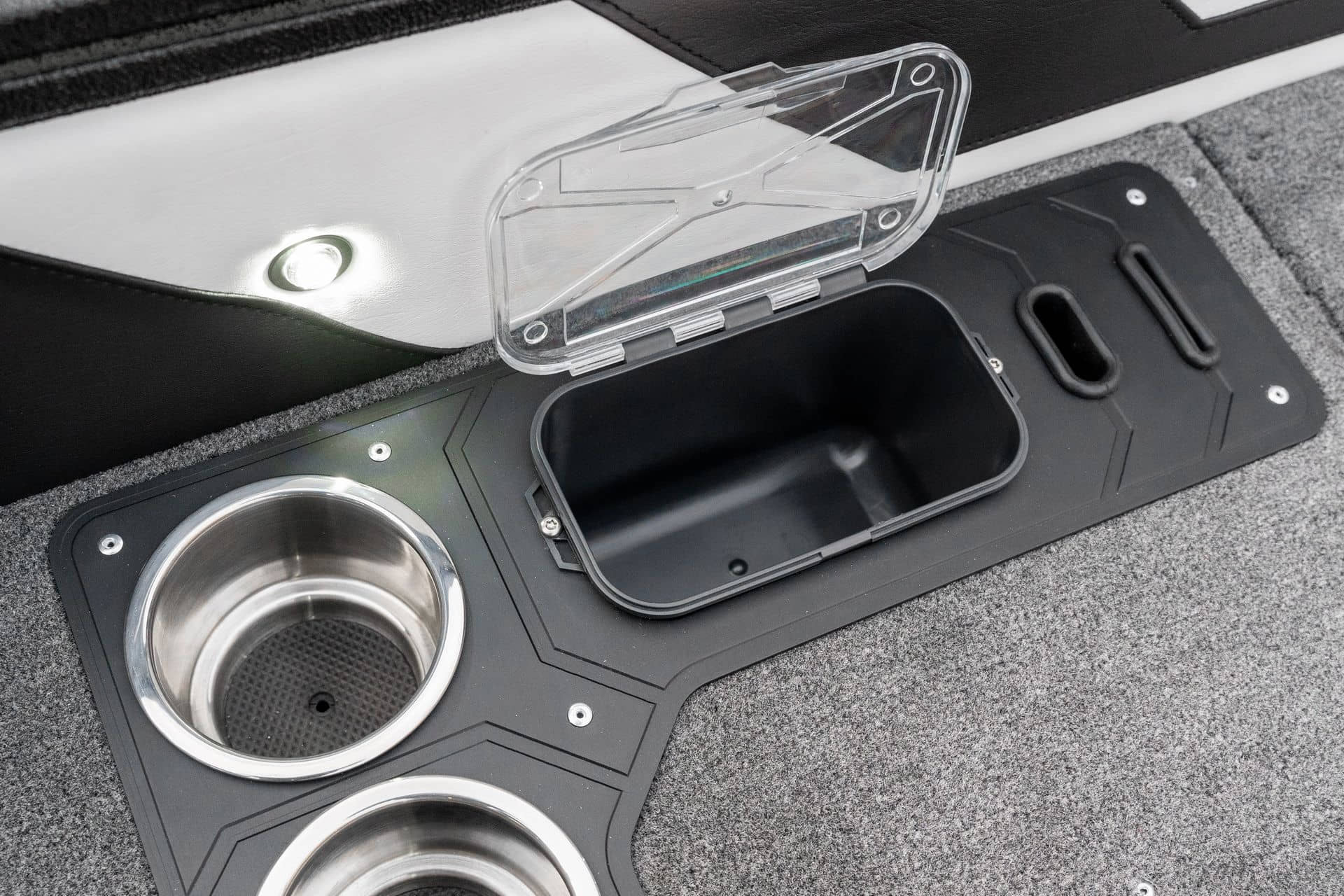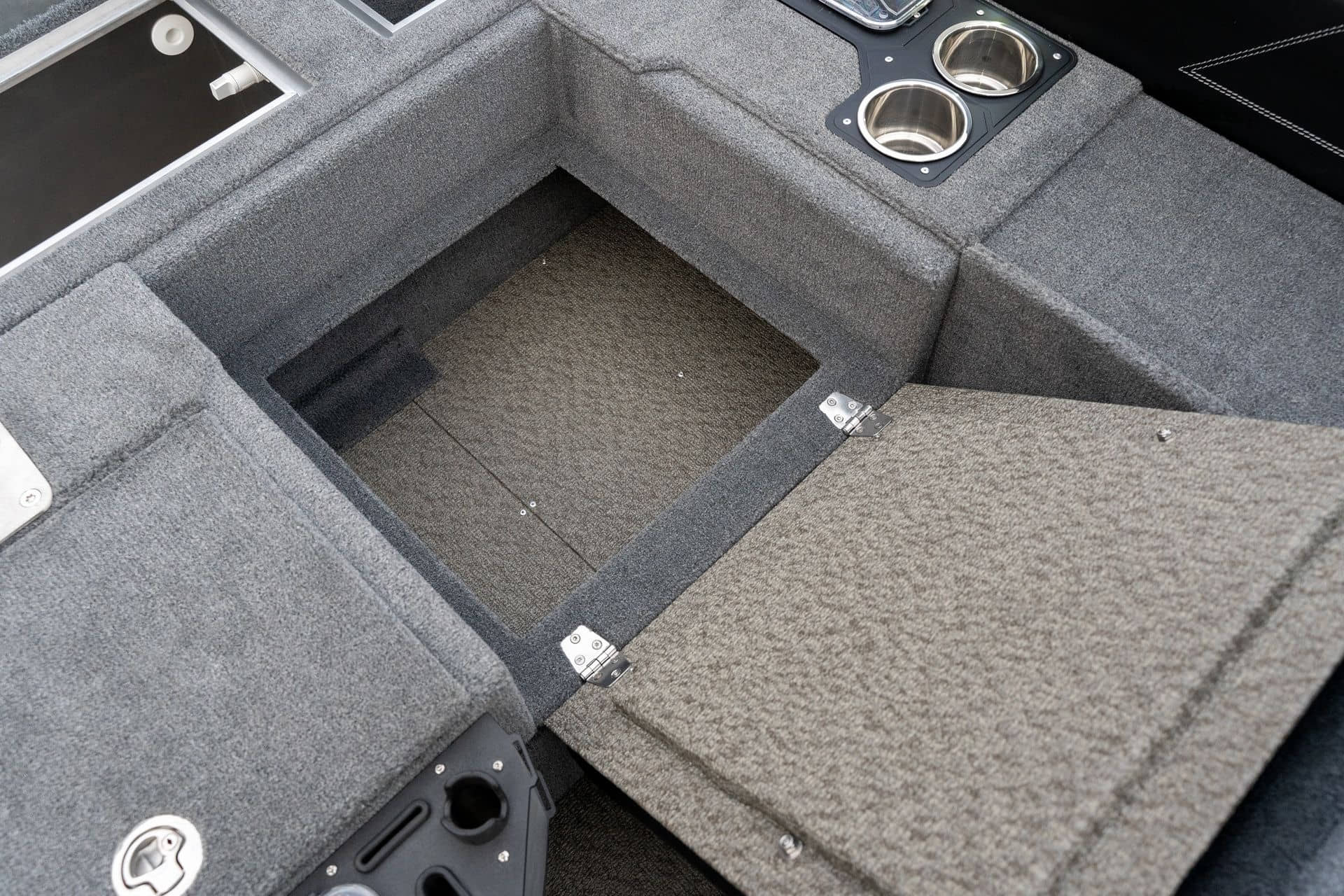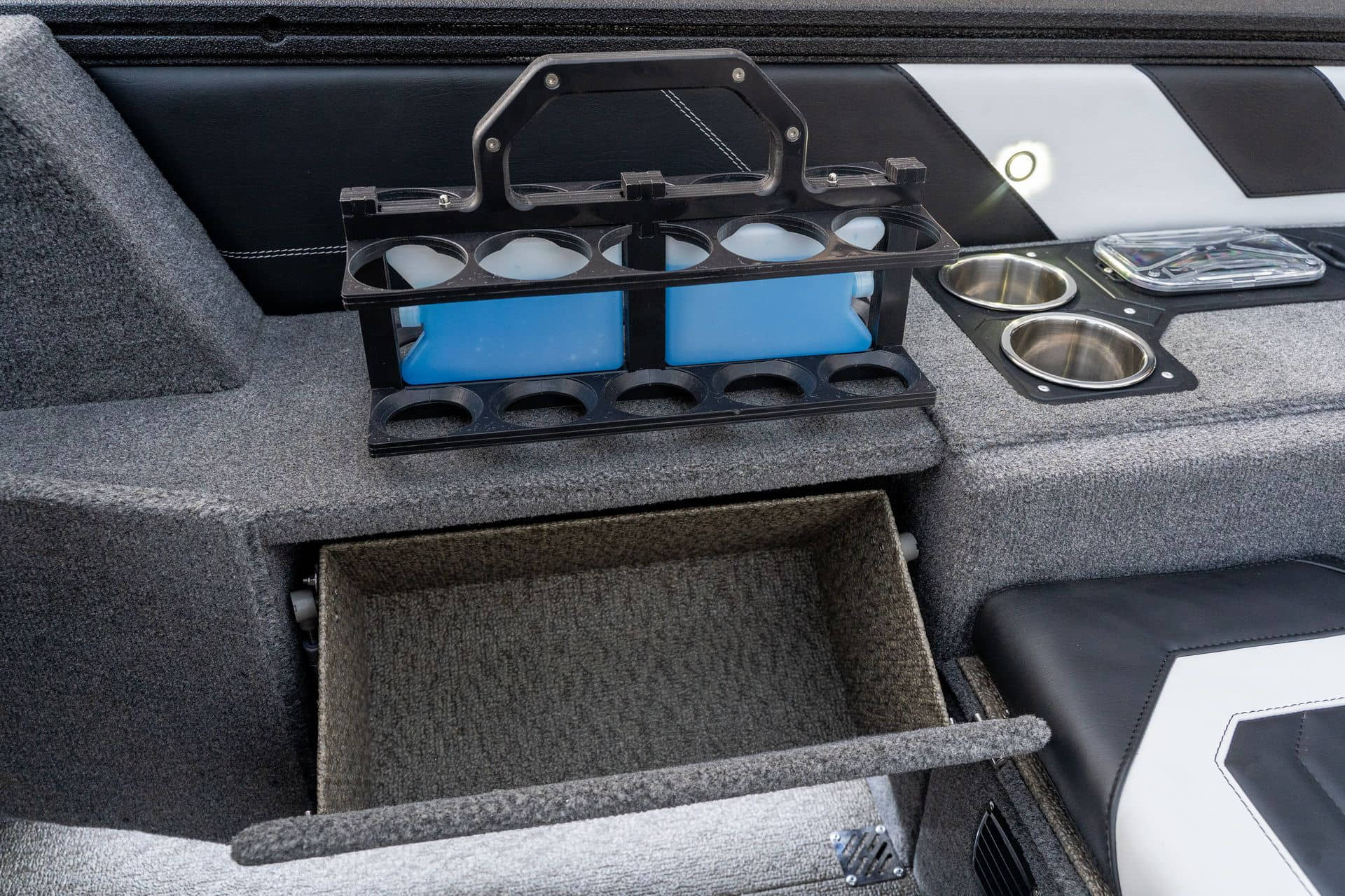 Celosvařené tělo Dvě konzole s kaleným sklem Lodní exteriérový koberec (rybářská paluba, zadní rybářská paluba a boční strany) Vinyl (kokpit) Suché boxy na věci a návnady s ventilačním a drenážním systémem Bateriový box v zadní části Úložný box na markýzu Boxy v konzolách pro uložení rybářského nářadí a osobních věcí Boční zásuvky v kokpitu 110 l nádrž na ryby v zadní části s okysličováním, osvětlením a časovačem recirkulace 227 l palivová nádrž pro přívěsný motor s palivovým filtrem Ovládací panel s 12 tlačítky Dvě USB zásuvky - typu C na konzole řidiče a spolujezdce Navigační světla (zelená, červená) LED osvětlení pro skříňky, kokpit, konzoly, paluby na přídi a zádi Nerezová rukojeť spolujezdce LED osvětlení ve skleněném rámu Zarážky pod sklo s frézovanými hliníkovými úchyty Ozdobné frézované hliníkové prolisy na bočním skle Příprava na instalaci echolotů, elektromotoru, hydraulického posilovacího čerpadla, autonomního ohřívače, vyhřívaných sedadel, vysokotlakého čističe Automatické odvodňovací čerpadlo Hlavní vypínač Nohy pro rybářské sedátko jsou ukryty v předních a zadních částech Sedadla řidiče a spolujezdce na tlumičích Zadní řada sedadel "Transformátor" na zadní palubě s individuálními organizéry pro cestující Šest výsuvných rohatek vyrobených z nerezavějící oceli Sada zámků na skříňky z nerezavějící oceli Teleskopický žebřík v pravé části Organizér mezi sedadly zadní řady Organizér pro kormidelníka Volant Krycí plachta