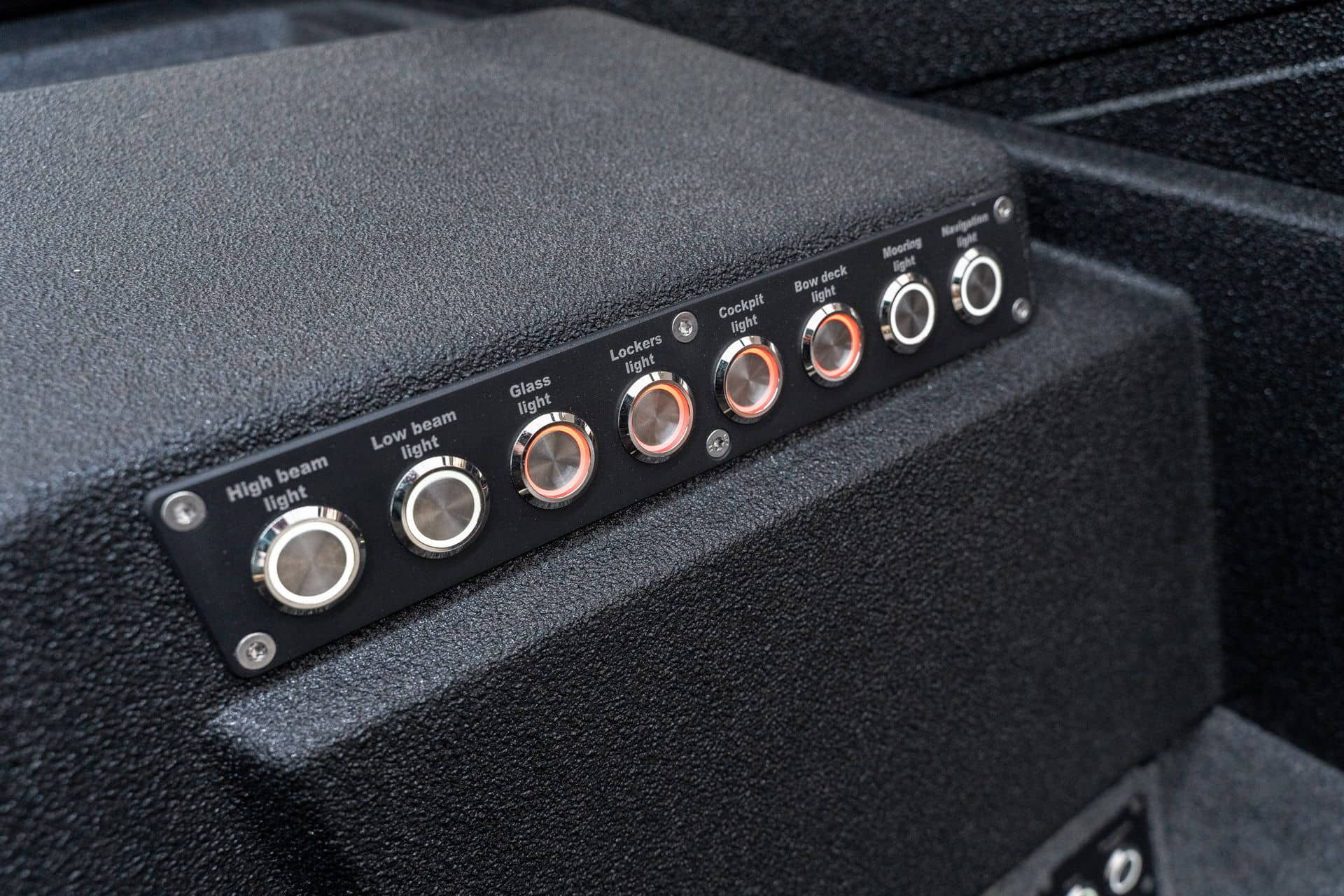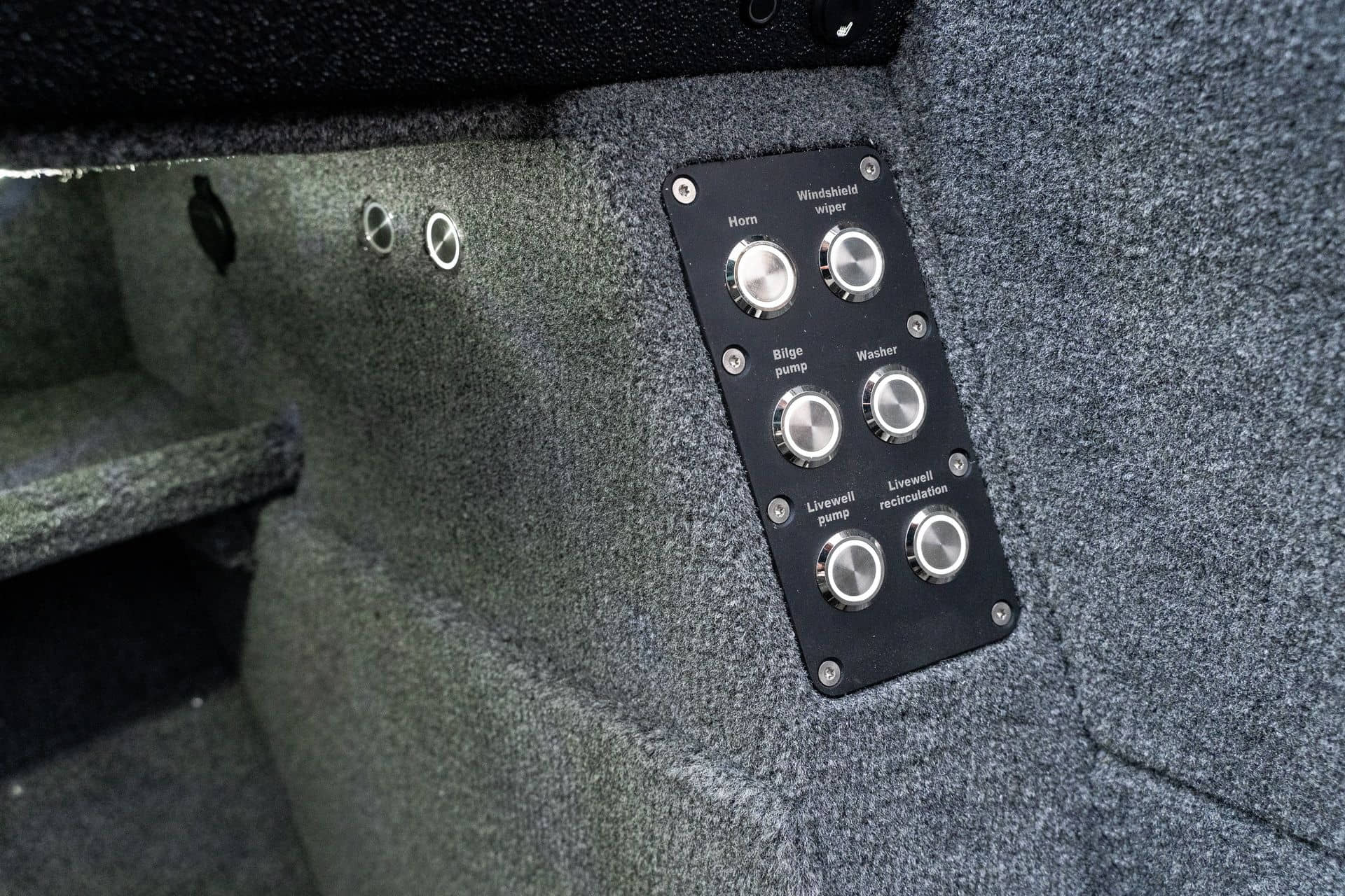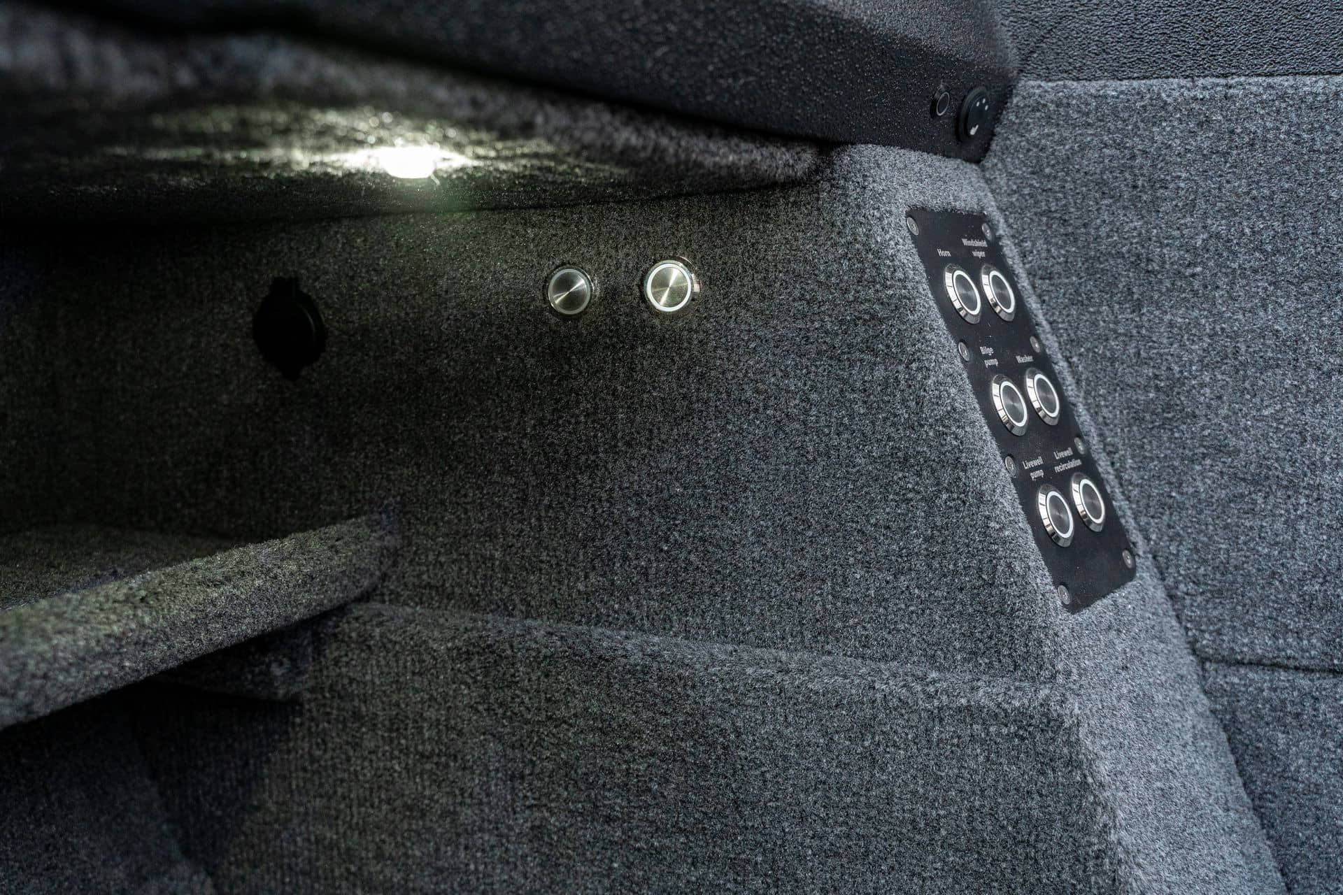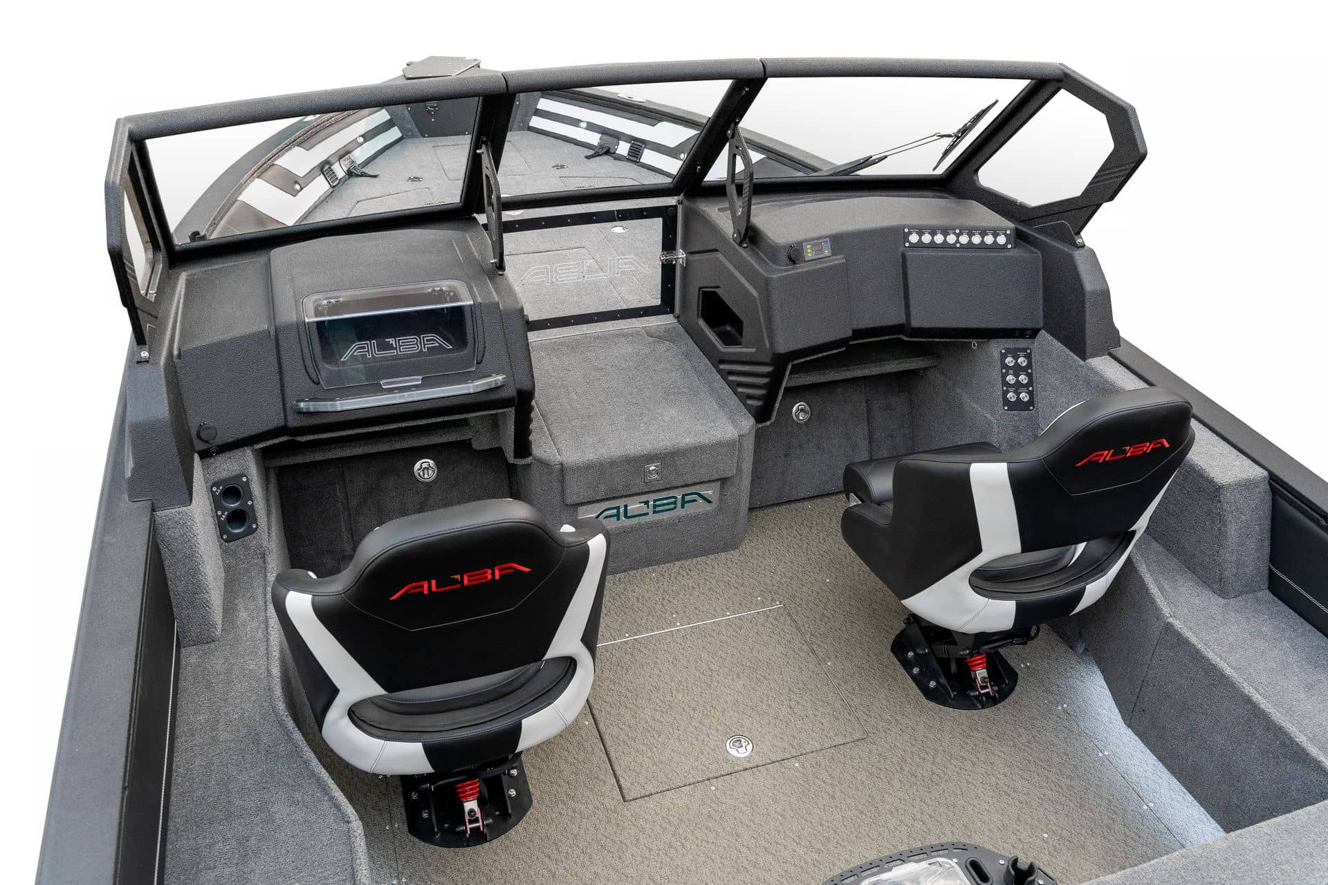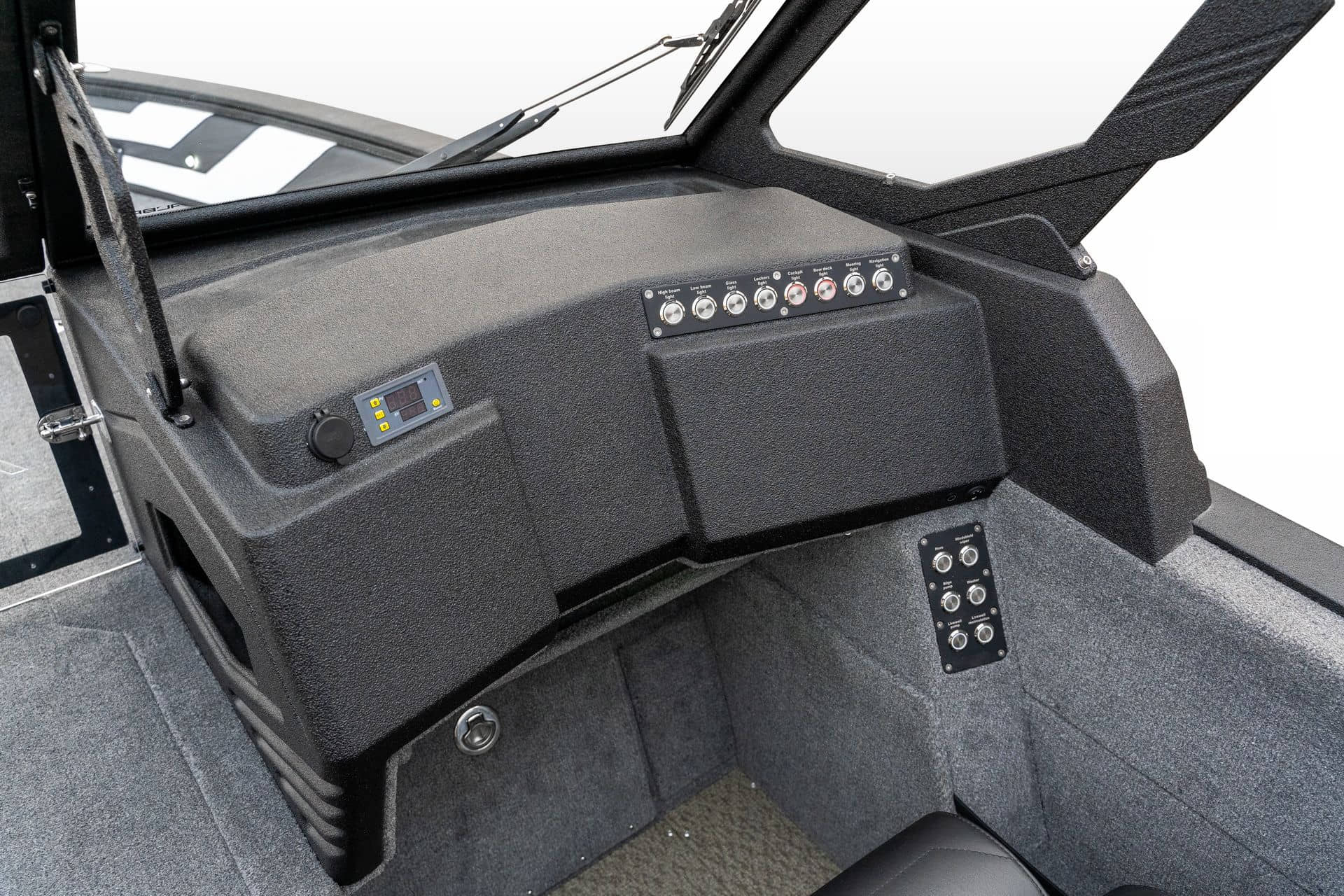 Moderní pokrytí paluby a kokpitu s materiálem FeelDeck s individuálním designem Individuální design paluby a kokpitu pro materiál FeelDeck Rybářské sedátko na rychloupínacím stojanu Povrchová úprava z umělé kůže na bocích paluby a kokpitu Přední paluba pokrytá kobercem a EVA materiál FeelDeck pro umístění návnady Hydrofobní fólie na bocích Přídavná 12 voltová zásuvka Přídavná USB zásuvka - typu C Podvodní osvětlení na zrcadle Autonomní naftový ohřívač Hydraulický systém řízení Ultraflex do 300 hp Stěrač čelního skla 1ks Vysokotlaký čistič Vyhřívání sedadel Cestovní krycí plachta Zvuková signalizace Organizér pro cestující vzadu Organizéry na nápoje v bočních skříňkách kokpitu s možností chlazení Průhledná rukojeť spolujezdce s ozdobnými prolisy z frézovaného hliníku a osvětlením Držáky sklenic na přední palubě Příprava na instalaci elektromotoru a baterií Držák elektromotoru na přídi